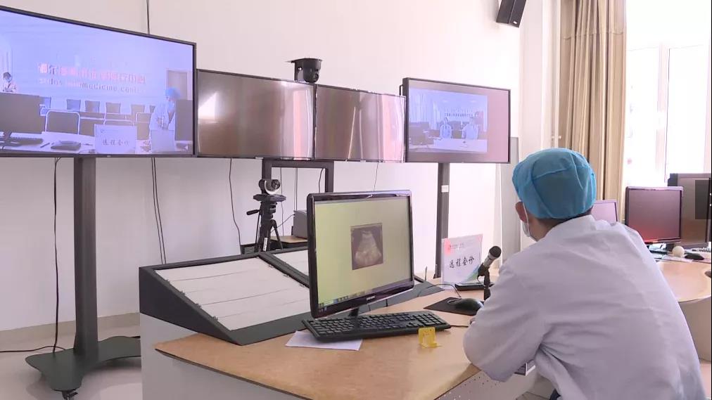 除了微信平台,鄂尔多斯市中心医院还通过远程会诊、共享医生等方式,维护孕产妇的健康。在鄂尔多斯市中心医院远程会诊办公室,一名超声科专家正在与杭锦旗人民医院进行远程会诊。会诊的患者是一名产后妇女,检查过程中,医生发现异常,向市中心医院超声科提出会诊,超声科医生对产妇的彩超影像进行了分析,并提出了专业意见。