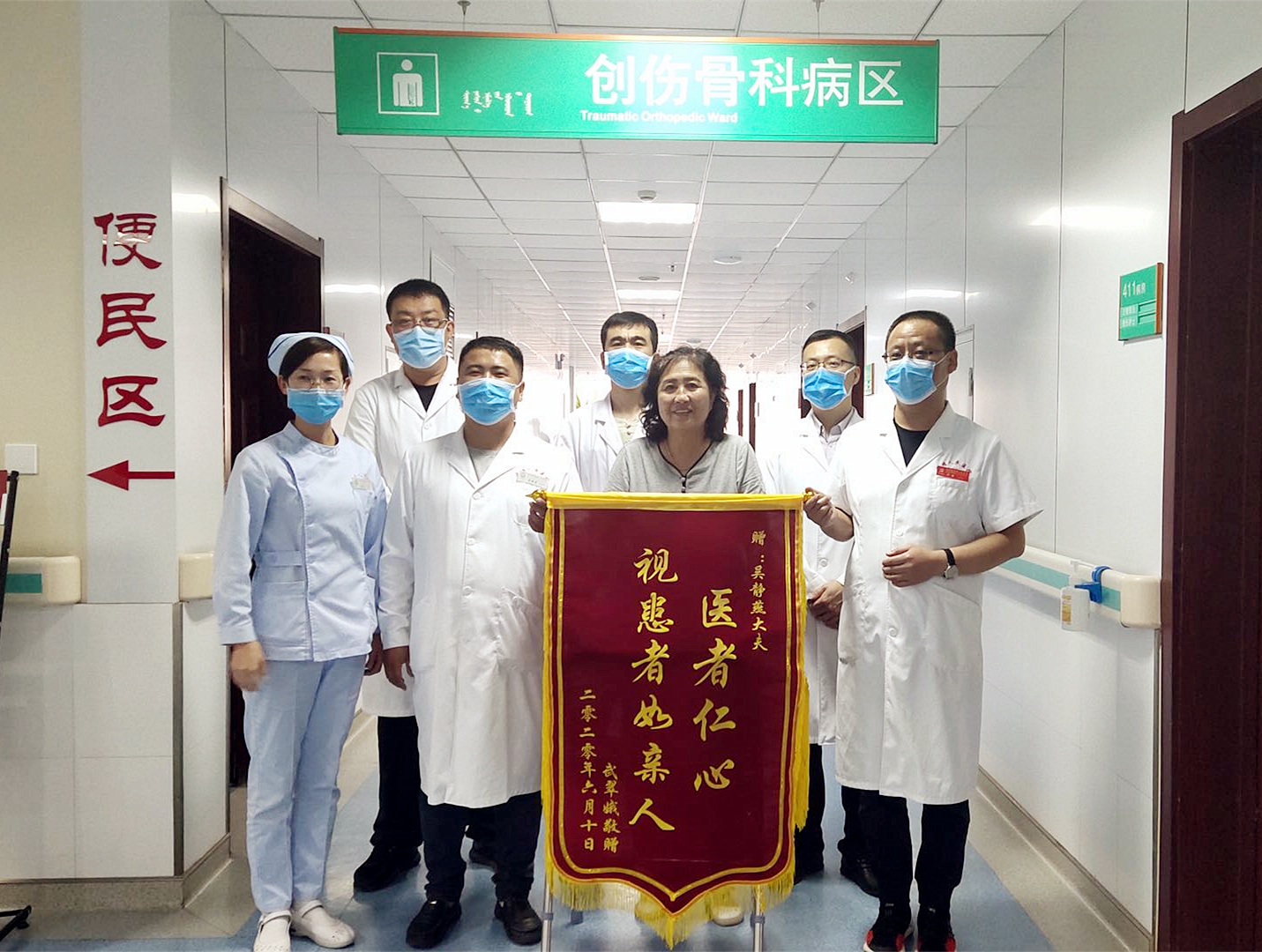 6月11日,患者武阿姨将印有“医者仁心,视患者如亲人”的锦旗,亲自送到乌拉特前旗人民医院骨一科,对医务人员精心诊治及优质护理表示称赞与感谢。