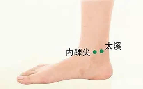 取穴:太溪穴位于脚踝部内踝尖后方,跟腱与内踝尖之间的凹陷处。