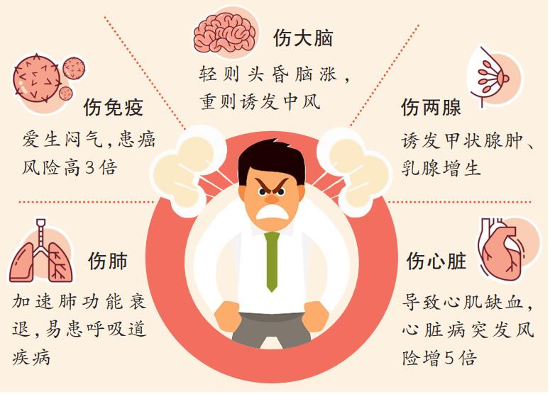 伤心脏和血管。俗语说“气急攻心”,临床上确实有由于严重精神刺激、恐吓、暴怒等心理应激引起肌肉中血流量高出正常水平,导致心肌供血障碍,发生心脏急性缺血、心跳减弱,叫应激性心肌病。虽然通常是一过性的,但对心脏也有损害,严重者可心律失常、心源性休克。哈佛大学一项研究发现,生气会导致心梗或急性冠脉综合征危险增加4.74倍。《欧洲心脏杂志》上一项研究发现,在愤怒情绪爆发后的2小时,中风风险会增加3倍,心脏病突发风险会增加5倍。