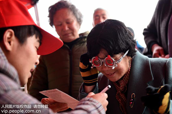 资料图片:党员志愿者为群众开展视力筛查,配送老花镜。(龚献明/人民图片)