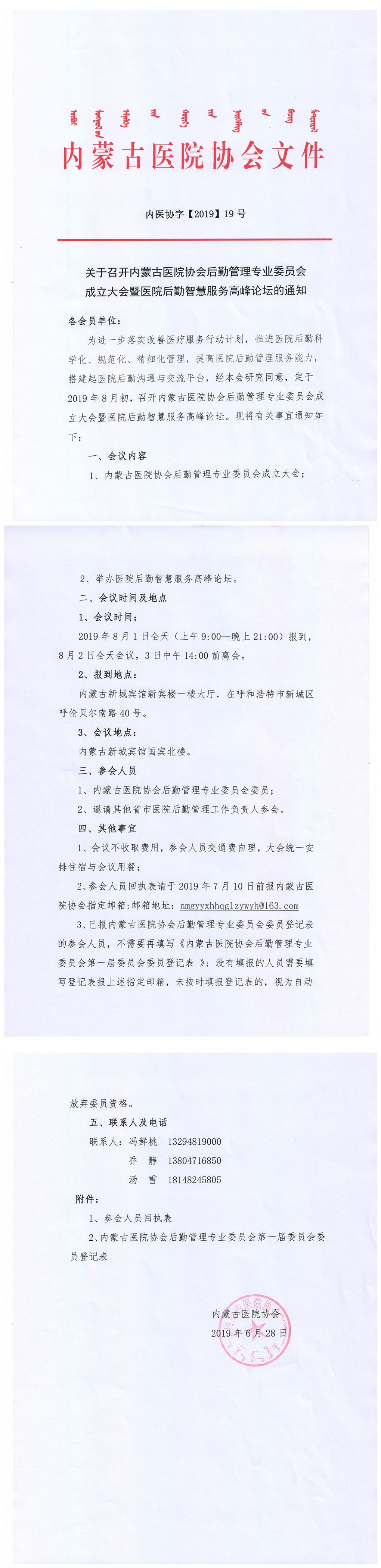 关于召开内蒙古医院协会后勤管理专业委员会成立大会暨医院后勤智慧服务高峰论坛的通知